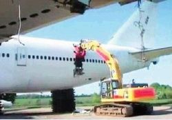İngiltere'de dünyanın en büyük uçak mezarlığının bulunduğu Cotsvvold Havalimanı'nda 230 tonluk bir Boeing 747 yolcu uçağı iş makinesi yardımıyla parçalara ayrıldı.