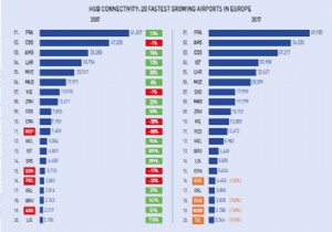 En çok büyüyen 20 havalimanı arasında Avrupa’dan sadece 4 havalimanı yer alırken İstanbul Atatürk Havalimanı %591 artışla %291 artış gösteren Moskova Sheremetovo Havalimanı’nın önünde Avrupa’da Hub bağlantısı en çok büyüyen havalimanı oldu.