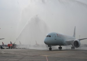Atatürk Havalimanı’na inişte itfaiyenin geleneksel su takı ile karşılanan Boeing 787 Dreamliner uçağı ile İstanbul’a 245 yolcu geldi. Yolculara uçaktan inişte lokum ikram edildi.