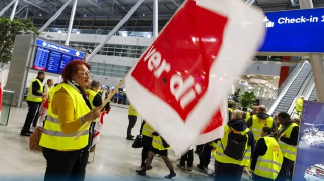 Almanya'nın en yoğun dördüncü havalimanı olan ve yılda yaklaşık 20 milyon yolcuya hizmet veren Düsseldorf Havalimanı'nda (DUS), örgütlü olan Ver.Di Sendikası'nın üyesi işçiler, çalıştıkları yönetim, check-in, apron, yolcu ve mürettebat taşımacılığı ve bagaj taşıma departmanlarında bir günlük greve gitti. Düsseldorf Havalimanında 100'ü aşkın uçuş iptal edildi.