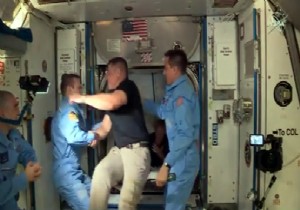 NASA'nın sosyal medyada yayınladığı görüntülerde, astronotların birbirleriyle tokalaşma ve sarılma anı çekilen fotoğraflarla ölümsüzleştirildi.