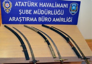 İstanbul Atatürk Havalimanı’nda Suriye uyruklu M.G. isimli yolcu beraberinde tarihi eser sayılan ve yurtdışına çıkarılması yasak olan tarihi kılıçlarla yakalandı