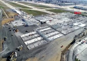 Koronavirüs ile mücadele kapsamında yapımına başlanan Atatürk Havalimanı'ndaki bin yataklı hastanenin tek katlı bina bölümünün yapımına başlandı. Çalışmalar havadan görüntülendi.