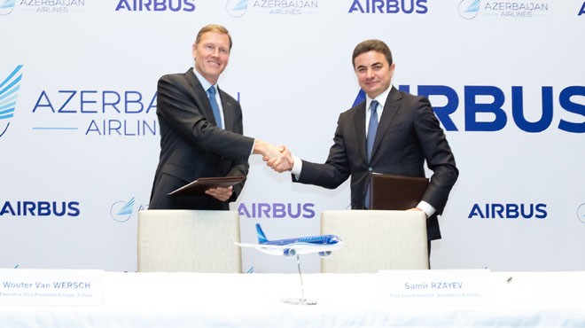 AZAL (Azerbaijan Airlines) CEO'su Samir Ryzayev ve Airbus Avrupa Müdürü Wouter Van Wersch'ın katıldığı imza töreni Bakü'de yapıldı. AZAL'ın uçak siparişlerinin, filoyu genişletmek ve pazarda rekabet gücünü artırmak stratejisi kapsamında verildiği belirtildi.