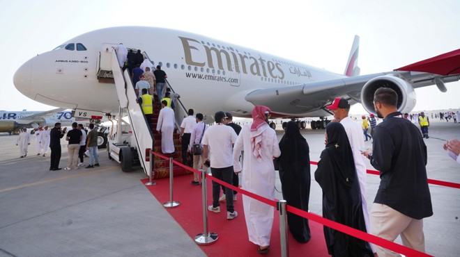 Emirates A380’i, 2022 Bahreyn Uluslararası Havacılık Fuarı’ndaki (BIAS) iki günlük gösterimi boyunca sekiz bine yakın kişi ziyaret etti. Ticaret amaçlı gelen ziyaretçiler, havacılık tutkunları ve fuara ilgi gösteren diğer ziyaretçiler, lüks deri koltuklar, şık ahşap detaylar, geniş koltuk mesafesi, kolay erişilebilir şarj noktaları, gökyüzündeki en büyük ekran ve daha birçok nazik dokunuşla öne çıkan havayolunun yeni Premium Economy Class kabini dâhil en yeni ve ayrıcalıklı ürünlerini inceleme fırsatı buldular.