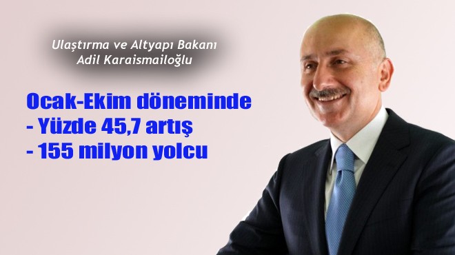 Karaismailoğlu, havalimanlarında iç hatlarda 66 milyon 245 bin, dış hatlarda 89 milyon 288 bin yolcu ağırladıklarına işaret ederek, "Direkt transit yolcular ile birlikte toplam 155 milyon 885 bin yolcumuza hizmet verdik. Yolcu sayımız geçen yılın ayını dönemine göre yüzde 45,7 artış gösterdi. Söz konusu dönemde havalimanları yük trafiği iç hatlarda 662 bin 625 ton, dış hatlarda 2 milyon 726 bin ton olmak üzere toplamda 3 milyon 388 bin tona ulaştı." ifadesini kullandı.