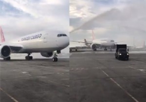Türk Hava Yolları, filosuna katılan Boeing 777 tipi kargo uçağı için yarın bir tören düzenleyecek. Uçak Atatürk Havalimanı’nda böyle karşılanmıştı