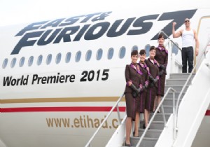 Birleşik Arap Emirlikleri'nin ulusal havayolu şirketi Etihad Airways ve Universal Pictures, Los Angeles Uluslararası Havalimanı’nda yaptığı lansmanla yeni lüks yolcu uçağı Hızlı ve Öfkeli 777’yi (Fast & Furious 777) görücüye çıkardı. Ünlü yapımcı ve oyuncu Vin Diesel de “Öfkeli 7” (Furious 7) filminin dünya tanıtımını başlatmak üzere uçağın yanındaydı.