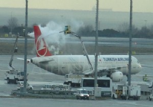 Atatürk Havalimanı’nda uçaklar kalkış yapmadan önce anti-icing denilen işlemle buzlanmaya karşı özel bir sıvıyla yıkanıyor. Alkol-glikoz karışımı sıvı uçağın kuyruk ve kanat gibi hareketli bölgelerine püskürtülüyor. Devlet Hava Meydanları İşletmesi ekipleri de oluşabilecek buzlanmaya karşı pistlere özel bir solüsyon döküyor.