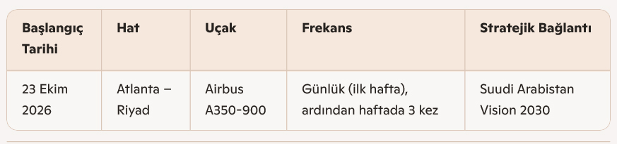 Delta Air Lines, Suudi Arabistan’a yönelik yeni uzun menzilli hattının başlangıç tarihini açıkladı. Şirket, Atlanta Hartsfield-Jackson Havalimanı ile Riyad King Khalid Havalimanı arasında 23 Ekim 2026 itibarıyla direkt uçuşlara başlayacak.  7.000 milin üzerinde olan uçuş mesafesiyle Delta’nın en uzun hatlarından biri olacak seferler, Airbus A350-900 ile yapılacak. Uçuşlar önce günlük, ardından haftada üç kez gerçekleştirilecek. Bilet satışları bugün başlıyor.