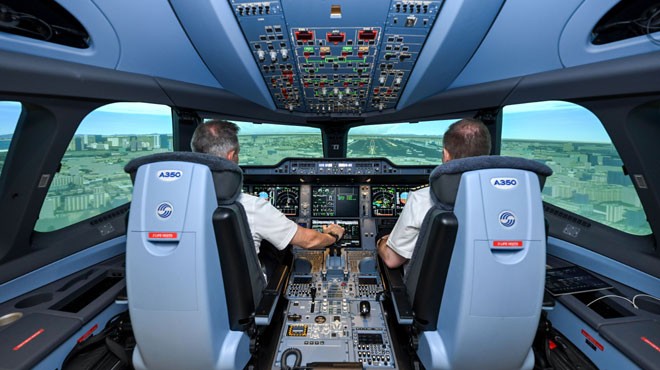 A350 sabit tabanlı eğitim cihazı, görsel ve işitsel sistemler kullanarak eğitim seanslarını olabildiğince gerçekçi hale getirmek için kokpiti taklit ediyor.