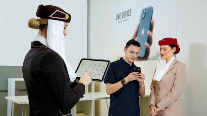Emirates, yolcu hizmetlerini geliştirmek ve kolaylaştırmak için Apple ürünlerinden yararlanarak "Tek Cihaz" adını verdiği yeni bir strateji başlattı. Havayolu bu kapsamda, uçaktaki yolcu hizmetlerini ve genel mürettebat deneyimini geliştirmek ve kolaylaştırmak için 20 bin kişiden oluşan kabin ekibinin tamamına özel Emirates uygulamaları ile yapılandırılmış iPhone 13 veya iPad Air sağlıyor.