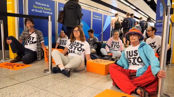 Londra Gatwick Havalimanı dün sabahın erken saatlerinde "Just Stop Oil" grubu aktivistlerin eylemine sahne oldu. Güney terminaline giren iklim aktivistleri, uçağa gidecek yolcuların kontrol noktaları önüne valizleriyle birlikte oturarak barikat oluşturdu.