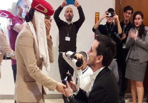 Kuveyt Havayolları’nda ‘Supervisor ‘ olarak görev yapan Berk Angun (32), Çelebi Hava Servisi’nin hizmet verdiği Emirates Havayolları’nda harekat memuru olarak çalışan kız arkadaşı Ceren Hökenek’e (24) Dış Hatlar Terminali’nde evlilik teklif etti.