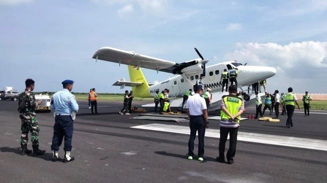Endonezya'da iniş takımları açılmayan Airfast Indenosia'ya ait DHC-6 Twin Otter 400 tipi uçak, Bali'deki I Gusti Ngurah Rai Havaalanı pistine gövde üzeri iniş yaptı.