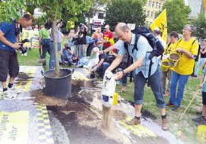 Mainz'daki bando takımının da destek verdiği eylemde, yeni açılacak temsili pist toprak dökülerek yeşillendirildi. "Fraport susacak, bizler konuşacağız", "Gürültü hastalık yapıyor ve öldürüyor" gibi sloganlar atan protestocular, daha sonra sessizce dağıldı.
