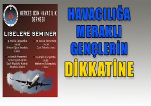 Havacılığa gönül vermiş gençlerin, havacılık kültürünün yayılması ve havacılık bilincinin oluşması için düzenledikleri seminerler başladı. Herkes için Havacılık Derneği’nin düzenlediği seminerlerin ikincisi bugün saat 14.30’da Gazi Teknik Lisesi’nde olacak. Seminerler 21 Aralık günü Gazi Mustafa Kemal Anadolu Lisesi’nde, 23 Aralık’ta ise Mehmetçik Anadolu Lisesinde yapılacak.