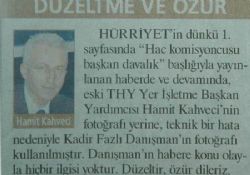 Hac operasyonunda görev yapan Türk Hava Yolları uçucu personeline konaklayacak yer ayarlayan ve otelde kalacak personel için otel yönetiminden kişi başı 10 dolar rüşvet aldığı iddiası ile hakkında 4 yıldan 12 yıla kadar hapis istemiyle dava açılan THY eski Yer Hizmetleri Başkan Yardımcısı Hamit Kahveci haberinde yanlışlıkla  Fazlı Danışman’ın fotoğrafını kullanan HÜRRİYET bugün özür diledi. Haberi dün birinci sayasından büyük bir şekilde gören gazete bugün beşinci sayfasından  küçük bir düzeltme ve özür yayınladı.