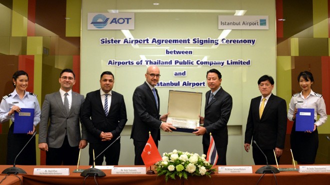 Dünyanın en prestijli havalimanlarından biri olan İGA İstanbul Havalimanı, Airports of Thailand (AOT) ile kardeş havalimanı ilişkisi tesis edilmesine ilişkin mutabakat sözleşmesi imzaladı. İGA İstanbul Havalimanı CEO’su Kadri Samsunlu ve Airports of Thailand Başkanı Nitinai Sirismatthakarn tarafından Tayland’ın başkenti Bangkok’ta imzalanan işbirliği ile iki ülke arasındaki ilişkilerin yeni bir boyut kazanacağı açıklandı.