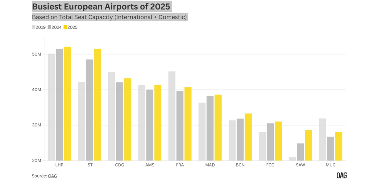 Havacılık sektörünün dijital pusulası ve küresel havacılık stratejilerinin belirlenmesinde en güvenilir otoritelerden biri olarak kabul edilen İngiltere merkezli köklü kurum OAG, 15 Ocak 2026 tarihinde Küresel Havayolu Planlama Verileri (Global Airline Schedules Data) kullanılarak hazırlanan '2025 Yılının Dünyadaki En Yoğun Havalimanları' raporunu yayımlandı.