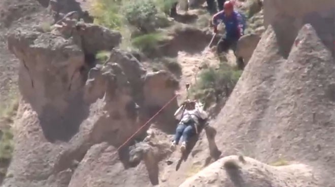 Kapadokya'da peri bacalarının üzerine inen sıcak hava balonundaki turistleri kurtarmak için ekipler harekete geçti