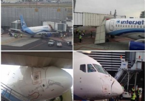 Mexico City’deki Benito Juarez Havalimanı ilginç bir yer kazasına sahne oldu.Interjet Airlines'e ait Sukhoi Superjet tipi uçak, manevra yaptığı sırada yolcu körüğüne çarptı. Havalimanının 1 numaralı terminalindeki 2 numaralı Gate’te park halinde olan uçak manevra yaptığı sırada 3 numaralı Gate’in körüğüne çarptı.İçinde yolcusu bulunmayan uçağın burun kısmı hasarlandı.