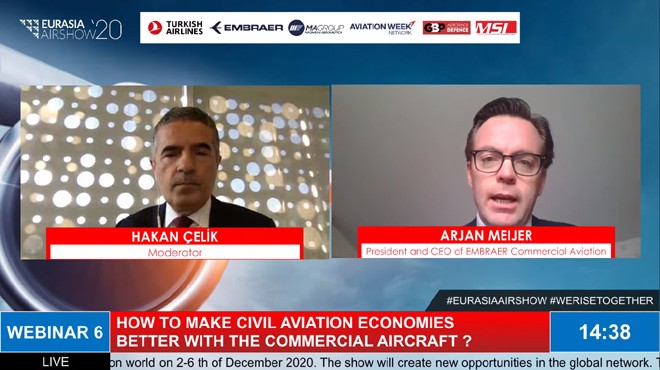 Sivil havacılık, savunma ve havacılık sektörlerinin her kademesinden önde gelen firmaları bir araya getiren bölgesel havacılık fuarı organizasyonu Eurasia Airshow 2020’de yerli ve yabancı toplam 343 firma katıldı. Fuarının son gününde “Ticari Uçaklar Sivil Havacılık Ekonomilerini Nasıl İyileştirir” başlıklı webinara dünyanın önemli uçak üreticilerinden Embraer'in Ticari Havacılıktan sorumlu CEO’su Arjan Meijer katıldı. Salgın sonrası dönemde uçuş alışkanlıklarının nasıl değişebileceğinden bu yeni durumla nasıl başa çıkılacağına kadar çeşitli açılardan salgının havacılık endüstrisi üzerindeki etkisi ele alındı.