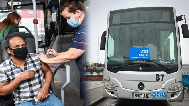Londra Luton Havalimanı’nda Covid-19 aşı merkezi olarak farklı bir yöntem oluşturuldu. Havalimanı yönetimi otopark ve terminal arasında sefer yapan servis otobüslerinden birini mobil aşı istasyonu haline getirdi.