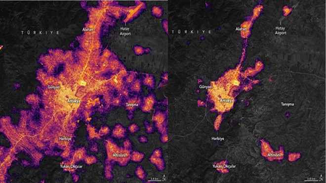 NASA'nın paylaştığı haritalarda deprem öncesi ve sonrası Antakya merkezinde ve çevresinden yayılan ışık miktarı gözler önüne serildi.