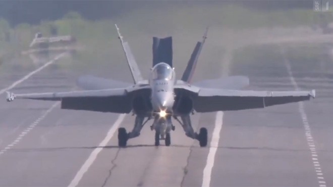 İsviçre'de gerçekleştirilen Alpha Uno tatbikatı kapsamında F-18 savaş uçakları ülkenin en işlek yollarından birinde iniş ve kalkış gerçekleştirdi