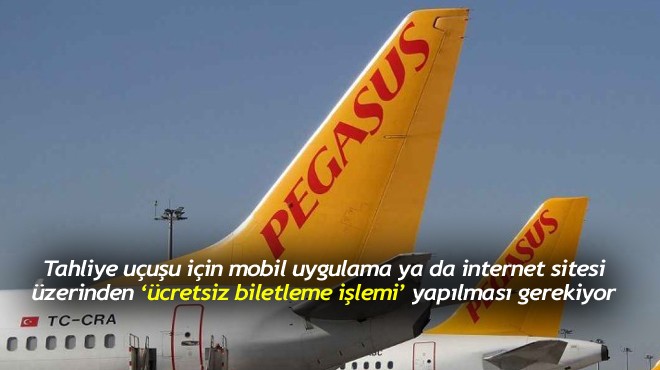 Pegasus, geçtiğimiz hafta 325 ücretsiz tahliye seferi gerçekleştirerek 61 bin 431 yurttaşımızın tahliyesini sağladı. Havayolu şirketi tahliye uçuşlarını bu hafta da sürdürüleceğini duyururken, misafirlerinin uçuşa gelmeden önce mutlaka mobil uygulama ya da internet sitesi üzerinden ücretsiz biletleme işlemini yapmalarını istedi