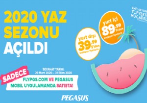 22 Ekim’e kadar 2020 yaz sezonu biletlerini flypgs.com ya da Pegasus Mobil uygulaması üzerinden alan misafirler, 29 Mart – 24 Ekim 2020 tarihleri arasında yurt içine 89,99 TL, yurt dışına ise 39,99 $’dan başlayan avantajlı fiyatlarla seyahat etme fırsatı yakalıyor.