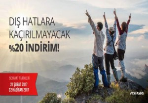 Pegasus Hava Yolları, biletlerini 20-22 Ocak tarihleri arasında alan tüm yolcularına 21 Şubat 2017 - 22 Haziran 2017 arasında yurt dışına yapacakları tüm uçuşlarda yüzde 20 indirimli fiyatlarla uçma fırsatı sunuyor.