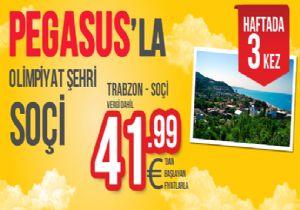 Pegasus’un 11 Ekim’de uçmaya başladığı Trabzon – Soçi direkt seferleri, 18 Ocak’tan itibaren haftanın 3 günü 41,99 Euro’dan başlayan fiyatlarla gerçekleştirilecek. Şubat ayında 2014 Kış Olimpiyatları’na da ev sahipliği yapacak olan Soçi’ye seyahat etmek isteyen Pegasus misafirleri; Salı günleri saat 01.45’te, Cuma günleri saat 02.10’da ve Pazar günleri saat 01.20’de; Soçi’den Trabzon’a ise yerel saatle; Salı günleri 05.05’te, Cuma günleri saat 06.15’te ve Pazar günleri saat 05.35’te kalkan seferlerle uçma fırsatı buluyor.