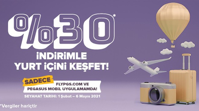 Pegasus Havayolları, misafirlerine 1 Şubat-6 Mayıs 2021 tarihlerinde yurt içine yapacakları seyahatlerde yüzde 30 indirimli uçma fırsatı sunuyor
