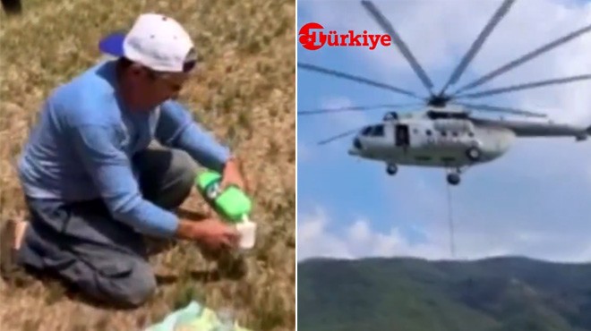 Denizli'de, orman yangınlarına müdahale eden bir helikopter zorunlu iniş yaptı. Olayın gören bir köylü evinde hazırladığı ayranı getirerek helikopterden inen Rus Pilot ve ekibe ikram etti.