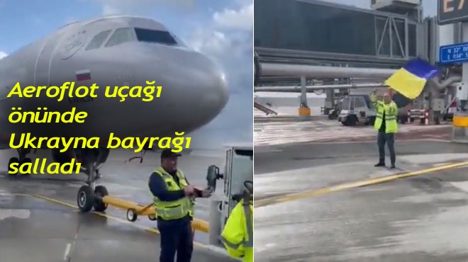 Tel Aviv Ben Gurion Havalimanı'nda bir yer görevlisi Aeroflot uçağı önünde Ukrayna bayrağı sallayarak protesto gösterisi yaptı