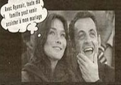 Şirket, ‘Le Parisien’ gazetesinde yayınladığı ilanda ikilinin Mısır’da çekilen bir fotoğrafını kullandı. Sonra da karikatürlerde olduğu gibi Bruni’nin ağzından bir konuşma balonu çıkararak “Ryanair sayesinde artık bütün ailem düğüne gelebilecek” yazdı. İlan Fransa’da espri konusu olurken, Cumhurbaşkanı Sarkozy’nin sözcüsü yasal işlem başlatacaklarını açıkladı.