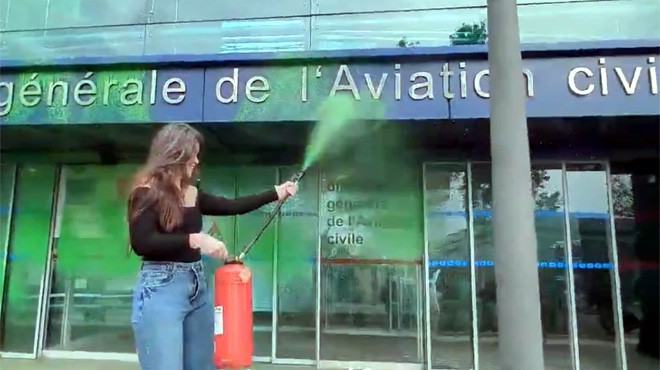 Fransa'da aktivistler, Sivil Havacılık Genel Müdürlüğü Binası önünde protesto eylemi gerçekleştirdi. Protestocular bina girişini yeşile boyadı