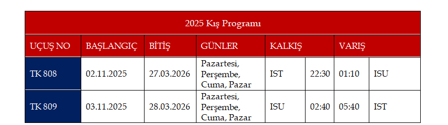 Türk Hava Yolları’nın Süleymaniye seferleri, İstanbul Havalimanı (IST) ile Süleymaniye Uluslararası Havalimanı (ISU) arasında Pazartesi, Perşembe, Cuma ve Pazar günleri olmak üzere haftada dört gün karşılıklı olarak icra edilecek olup, 27 Mart sonrasında ise uçuşlar her gün karşılıklı olarak gerçekleştirilecektir. Tarife detayları aşağıda yer almaktadır;