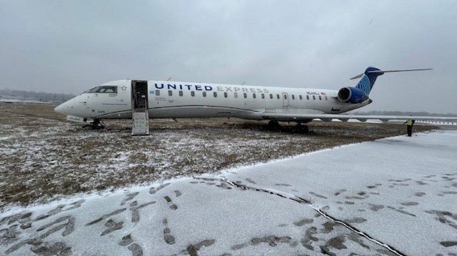 United Express'in Bombardier CRJ550 tipi uçağı, St. Louis Lambert Uluslararası Havalimanı'na inişinin ardından taksi yolundan çıktı