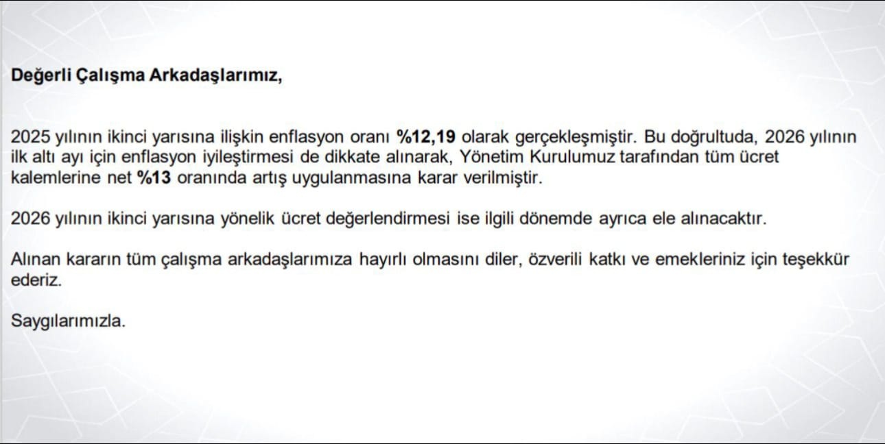2026 yılının ikinci yarısına yönelik ücret değerlendirmesi ise ilgili dönemde ayrıca ele alınacaktır. Alınan kararın tüm çalışma arkadaşlarımıza hayırlı olmasını diler, özverili katkı ve emekleriniz için teşekkür ederiz”