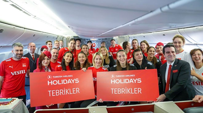 Türkiye’nin Kanatları Türk Hava Yolları’ndan bu haftasonu Japonya’da aldığı galibiyetlerle olimpiyat vizesi alan Filenin Sultanları’na özel jestler geldi. Bugün TK51 seferiyle Tokyo’dan İstanbul’a hareket eden millilerimize uçuşları öncesinde 1 haftalık "TurkishAirlinesHolidays" seyahat paketi hediyesi takdim edildi. Ayrıca, A Milli Kadın Voleybol Takımı Kaptanı Eda Erdem Dündar’a da Türk Hava Yolları Japonya Müdürü Ahmet Tuğcu tarafından takım adına bir tebrik çiçeği verildi. Tüm kafile seyahatlerini Business Class’ta gerçekleştirdi.