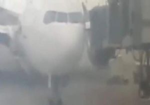 Boeing 777 tipi uçak yolcu körüğüne yanaştığı sırada motorlarından biri, park alınandaki boş bir konteyneri içine çekti.