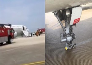 Uçağın ön dikmesindeki teker koptu ve parçalar sol motora zarar verdi.