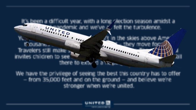 “Küresel bir salgının ortasında, uzun bir seçim sezonu ile zor bir yıl oldu ve hepimiz bu türbülansı hissettik. Yine de her gün uçaklarımız, Amerika'nın üzerinde göklerde… binlerce insan sadece bir arada yaşamakla kalmıyor, hayat devam ediyor. Yolcular hala birbirleriyle küçük sohbetler yapıyor. Kaptan, çocukları kokpite davet ediyor. Kabin memurları her an yardım elini uzatmak için hazır… Bu ülkenin sunabileceği güzellikleri -35.000 feet yüksekte ve karada- görme ayrıcalığına sahibiz ve birleştiğimizde daha güçlü olduğumuza inanıyoruz.”