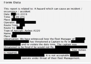 Bir filo yöneticisinin kaptan pilota görev zamanını ihlal etmesi için nasıl baskı yaptığına ve tehdit ettiğine tanıklık ettik. Kaptan uçmaz ise işten kovulmakla tehdit edildi. Tehdit altında uçmak kabul edilebilir değil.