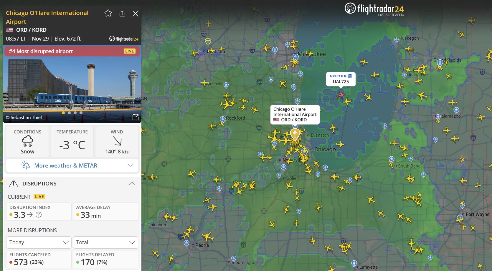 Şükran Günü sonrası bastıran yoğun kış koşulları, havayolu ulaşımını da olumsuz etkiledi. Ülke genelinde 1400'den fazla uçuş iptali yaşanırken, O'Hare'de akşam saatlerine kadar 1200'ü aşan iptaller kaydedildi.