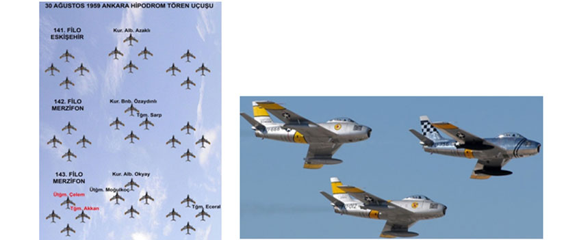 Solda 1959’da üç F-86 Filosunun merasim uçuşu düzeni. Kırmızı isimler şehit pilotların kol uçuşundaki yerleridir. Sağda ABD Hava Kuvvetlerinin üç F-86 uçağı kol uçuşunda