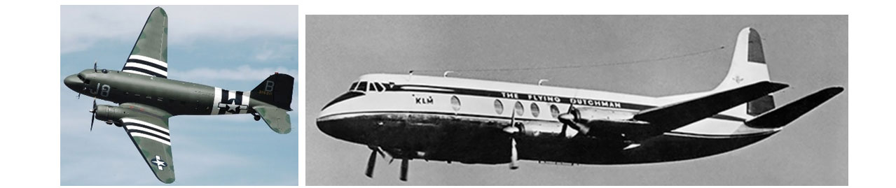 Solda Normandiya Çıkartması boyalarıyla Douglas C-47 Skytrain (Dakota), Sağda Vickers Viscount-745D uçuşta